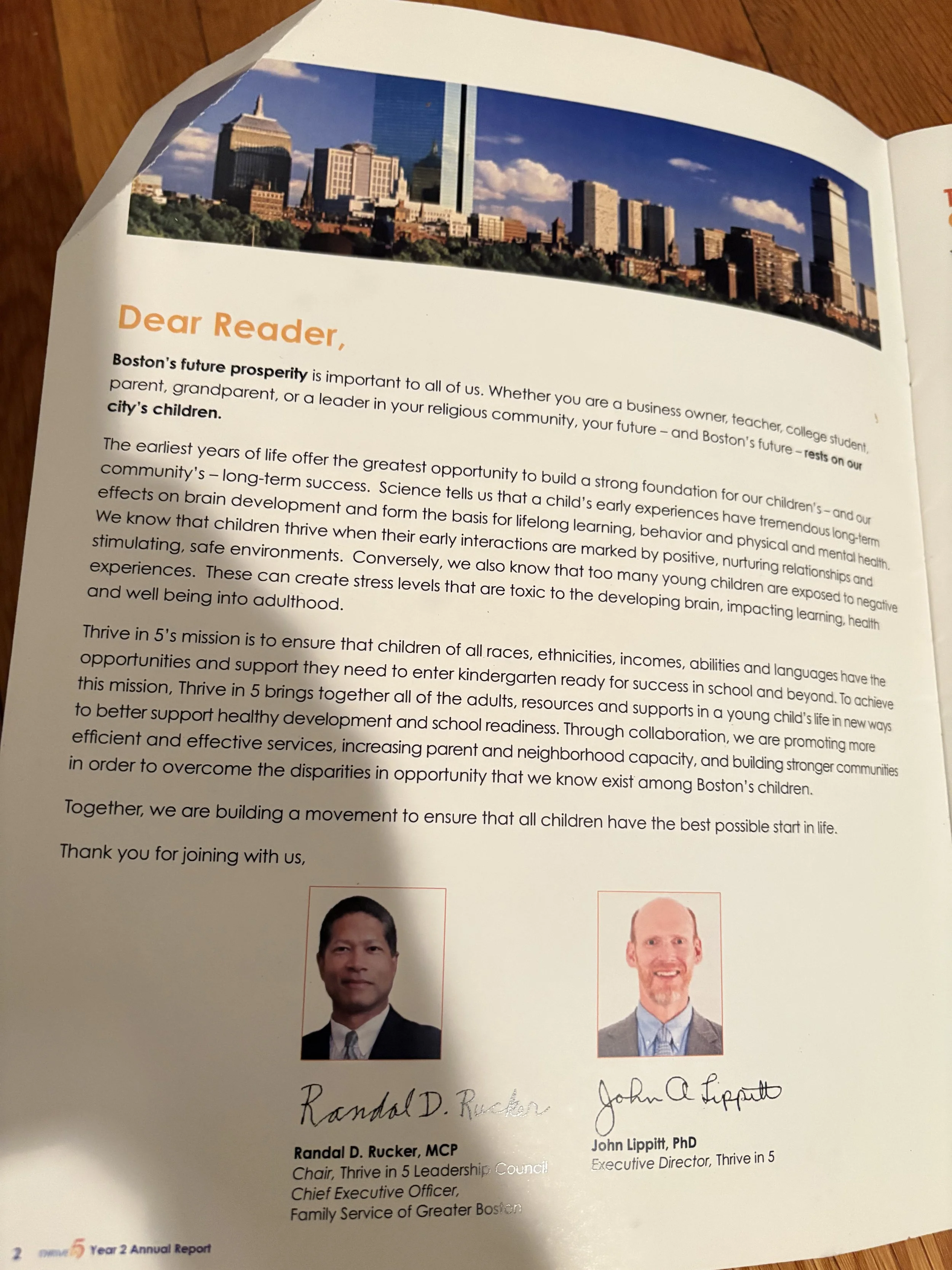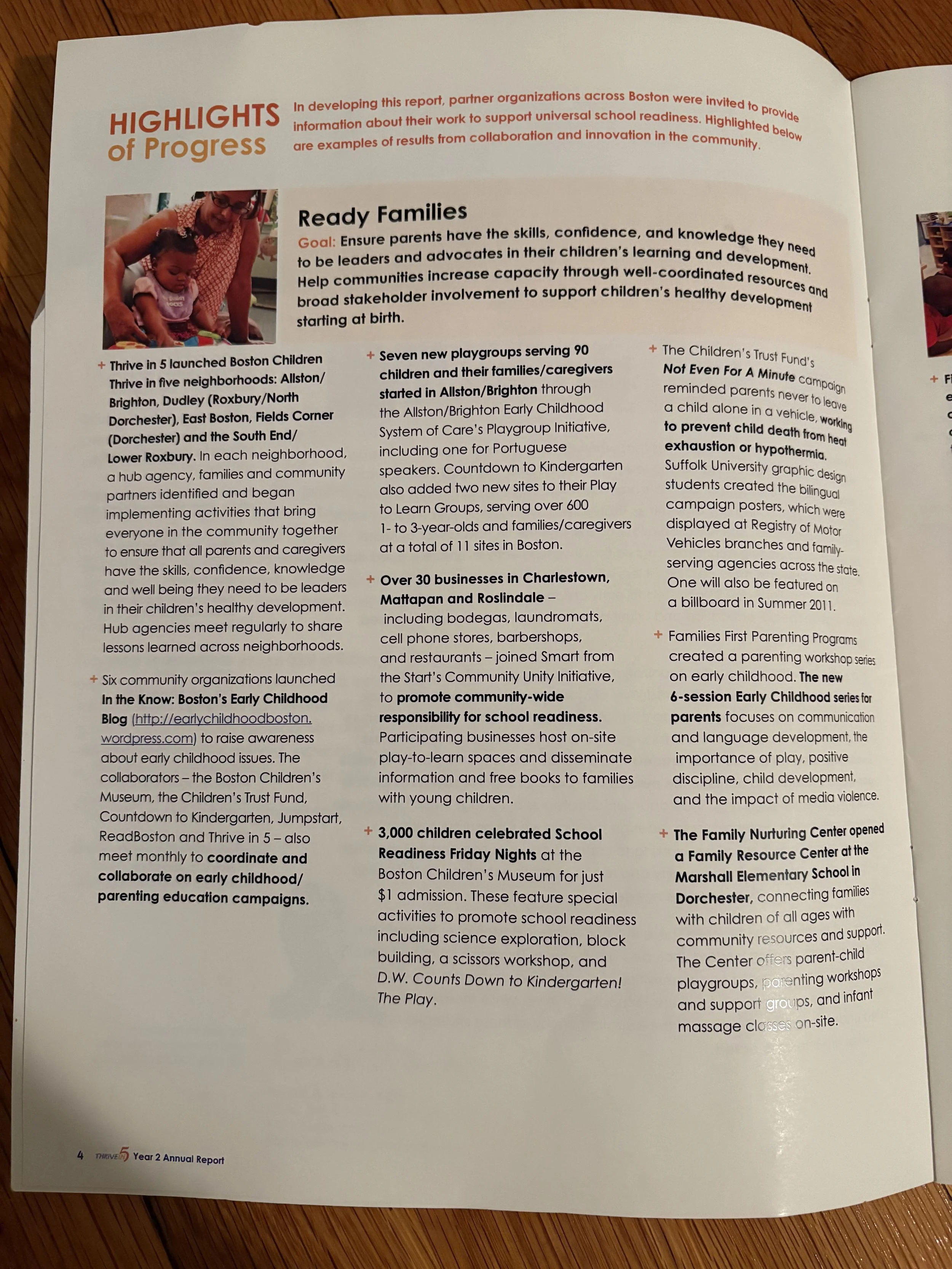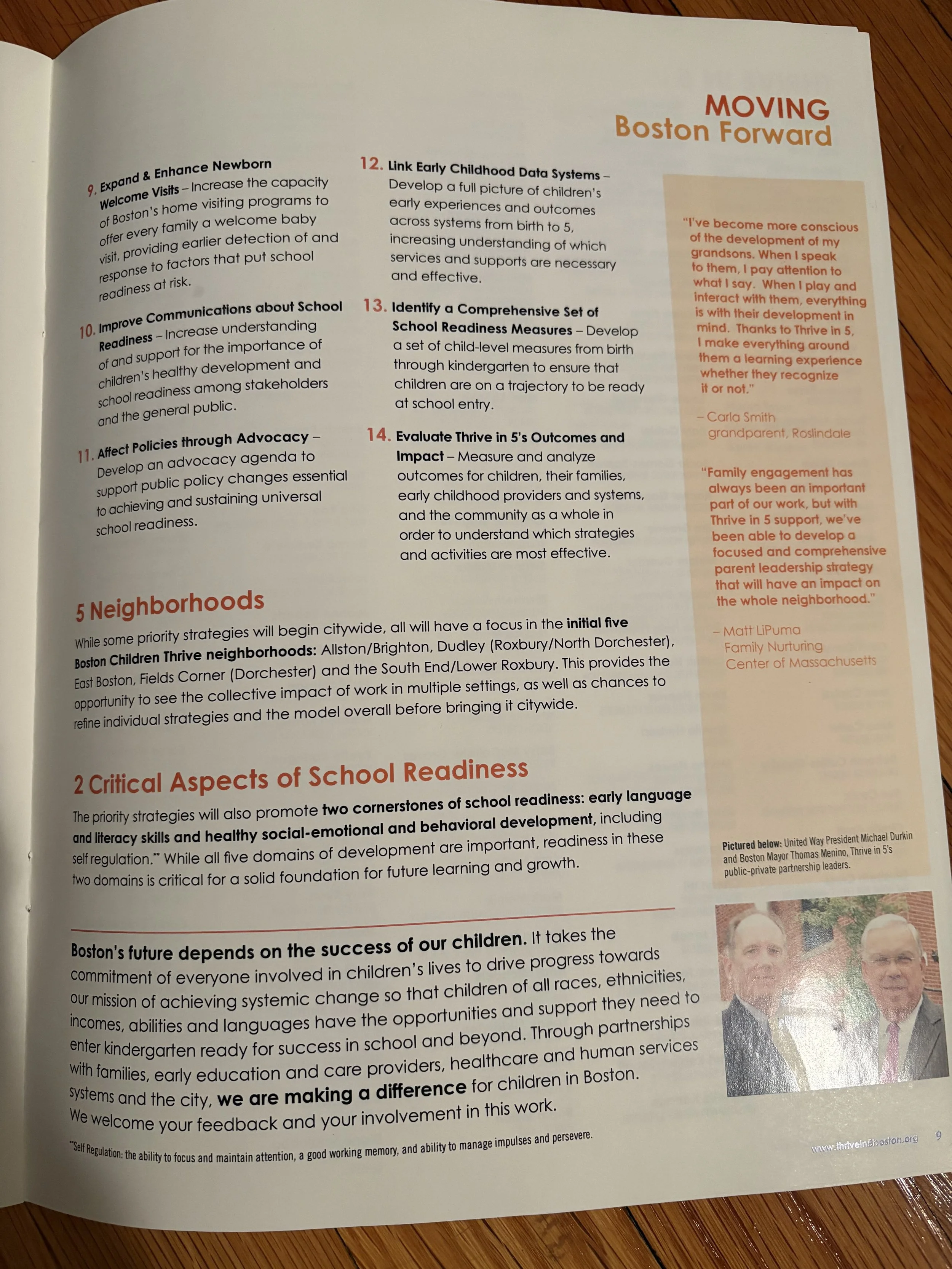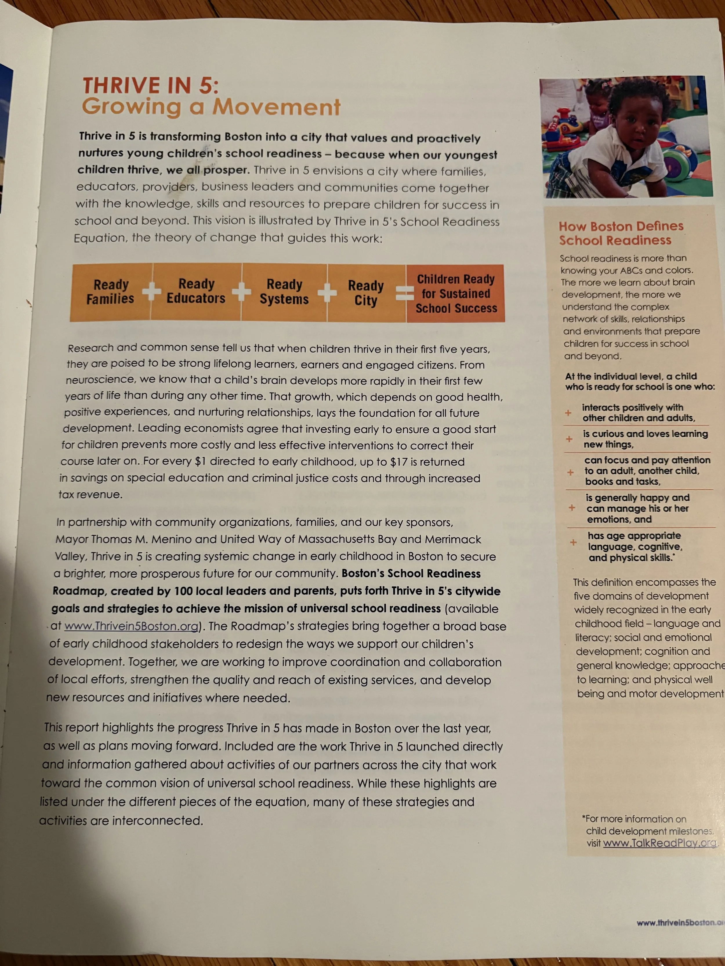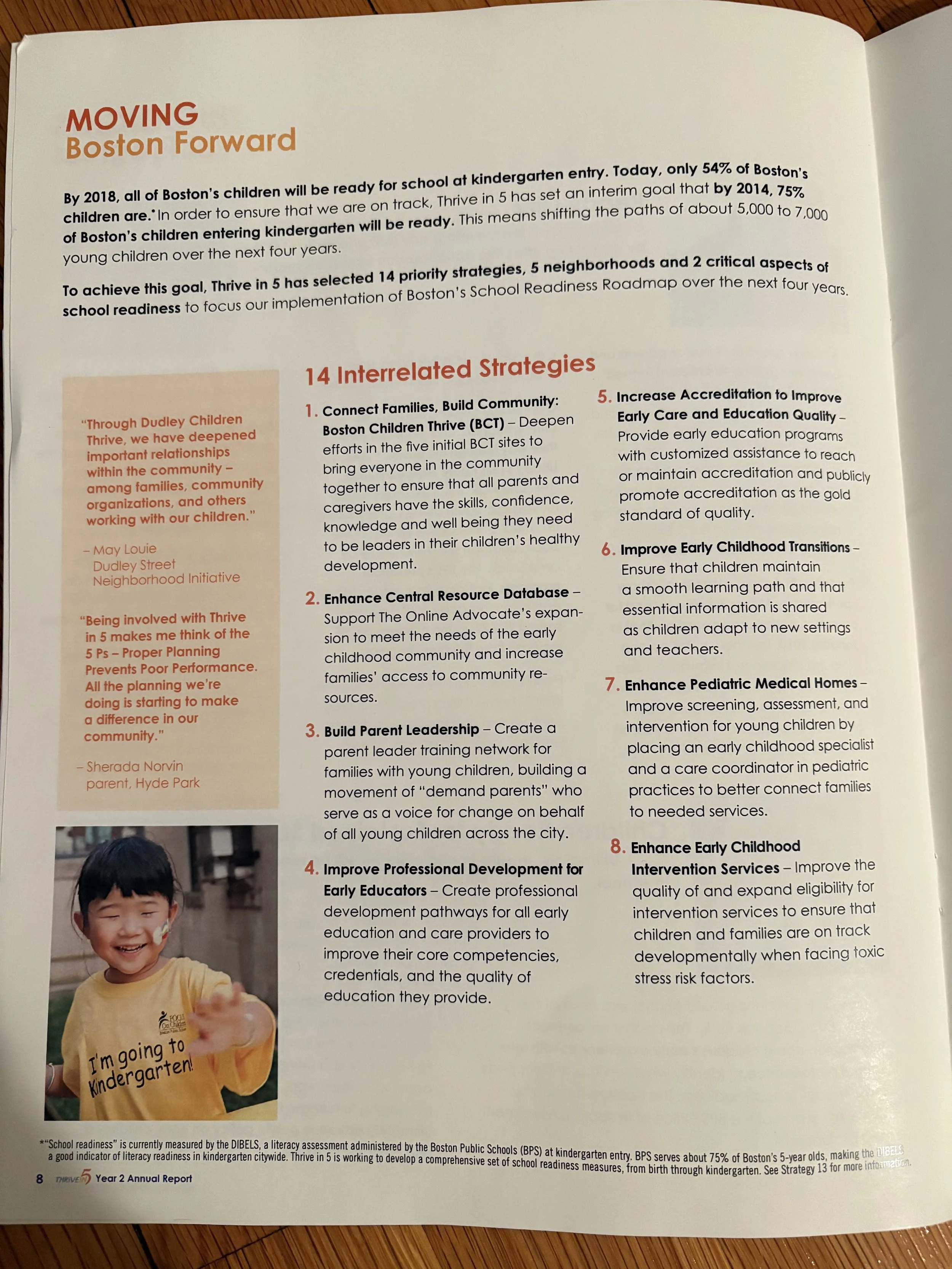 Looking at the photos from that 2011 report (see below), you can see that Thrive in 5 was really the primary engine for citywide early childhood strategy at the time. It was a partnership between the City of Boston and the United Way of Massachusetts Bay, functioning as what we call a "backbone organization." Their goal back then was incredibly ambitious: they wanted 100% of Boston’s children to be school-ready by 2018. When the report was written, only 54% of kids were hitting that mark, so they were looking to change the trajectory for about 5,000 to 7,000 children every year.